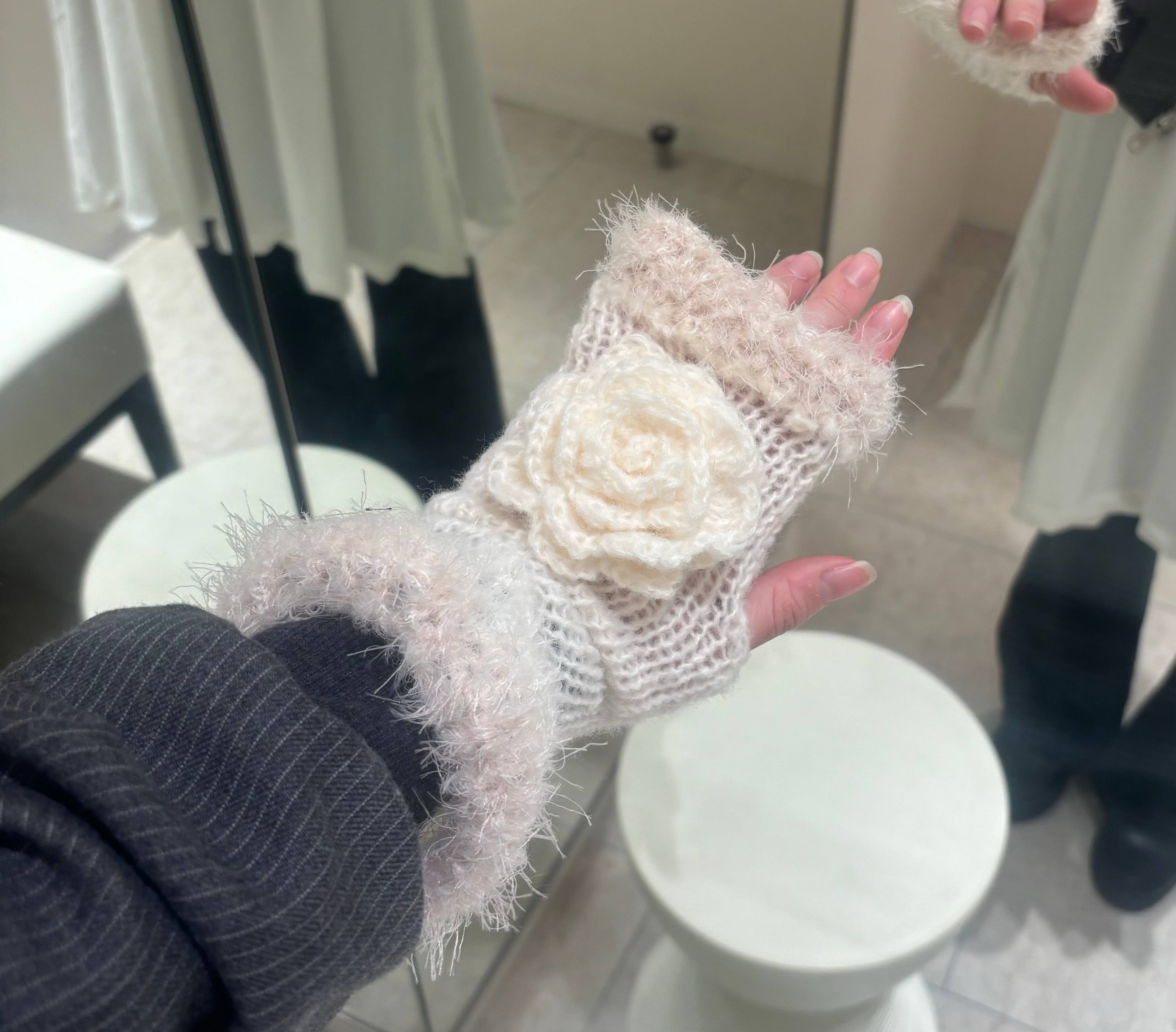 長さ25センチのarm warmerです。 モヘアの素材で制作されており、ワンポイントのバラが可愛いい商品です。